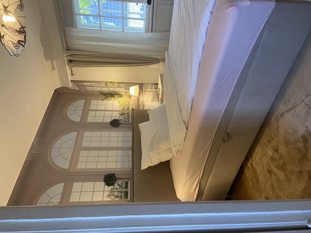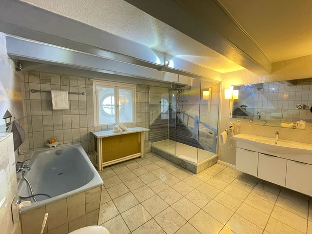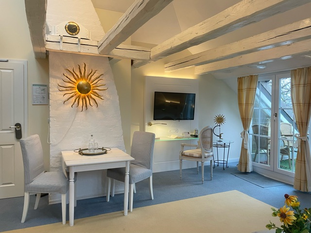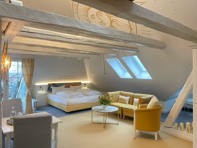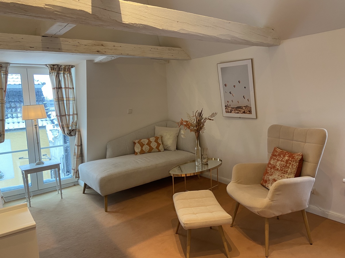 Wohn-/Schlafraum mit Kitchenette und Arbeitsplatz, kleiner Balkon, großes Bad mit begehbarer Dusche, Badewanne, Bidet