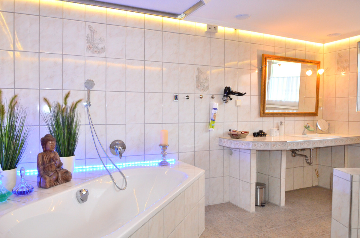 Besondere Erwähnung findet das große geräumige 12 qm Bad mit Eckbadewanne, großem Waschtisch, TV und eine besonders große 1,20 x 1,20 m große Regenfalldusche mit Kieselsteinboden.